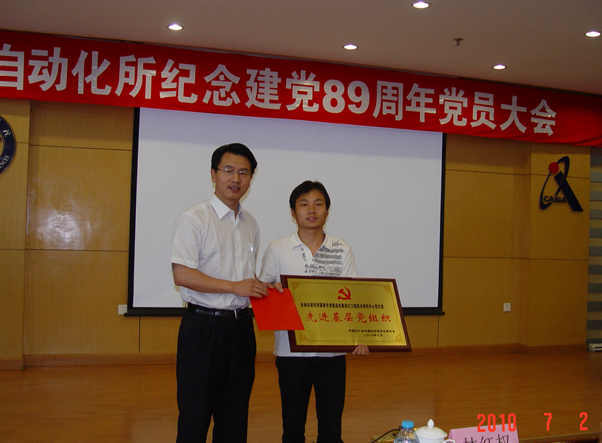 随后,自动化所党委书记何林为获得中科院京区先进基层党组织的国家专用集成电路设计工程技术研究中心党支部颁发了奖牌和奖金。据悉,7月1日,该支部被表彰为中科院京区先进基层党组织。