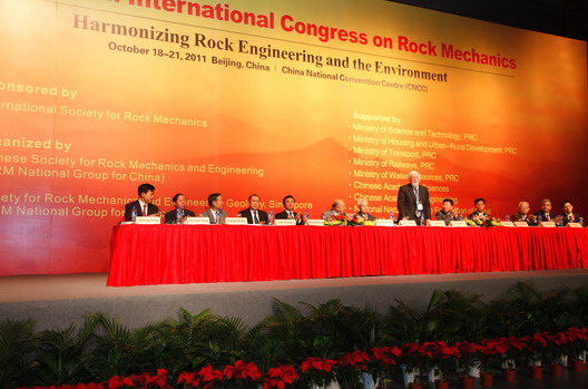 历经6年的辛勤筹备,第十二届国际岩石力学大会(ISRM2011)于10月18日在北京国家会议中心隆重开幕。来自50多个国家和地区的一千余名岩石力学专家学者参加了开幕式。会议收到来自中科院武汉岩土力学研究所等30多个单位和部门发来的贺信与贺电,共同祝贺此次岩石力学与工程国际学术盛会在我国召开。