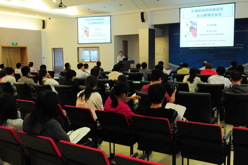 李灿院士首次从催化科学对近一百年来人类发展进步的推动作用以及近年来解决能源短缺、环境恶化对清洁、高效催化新技术的需求等方面阐述催化科学研究的重要性,讲述了该领域研究的发展方向和亟待解决的科学难点,并就光解水制氢方面的研究进展和大家进行了交流。随后,徐柏庆教授介绍了研究组近10年来在纳米金催化剂的制备及其在选择加氢方面的研究进展。徐杰研究员和刘海超教授分别讲述了他们在生物基多元催化利用中的研究成果。