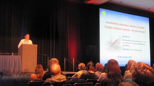 长江江豚的濒危现状得到了与会者的普遍关注。郝玉江和郑劲松博士通过口头报告和墙报两种形式介绍了水生所在长江江豚种群生态学和保护遗传学等方面开展的科研工作及取得的最新研究结果。王丁研究员还应邀与Randall Wells主席、IUCN鲸类专家组主席Randall Reeves先生及美国海洋哺乳动物国家委员会主席Frances Gulland女士等一道开会讨论柬埔寨湄公河伊河豚的保护计划。王丁研究员将应邀赴柬参加相关国际合作会议。