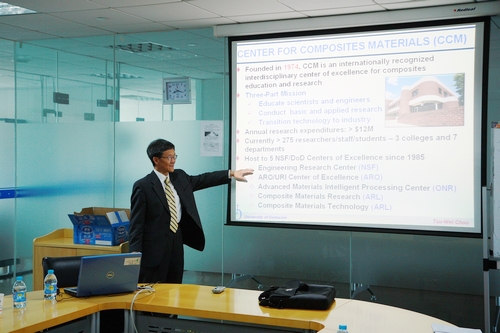 4月16日,入围2000-2010年全球顶尖一百名材料学家榜单的华人科学家、美国德拉维尔大学杜邦讲座教授邹祖炜 (Tsu-Wei Chou) 博士应邀来苏州纳米所进行学术访问,并作题为《碳纳米管纤维及复合材料》的学术报告。杨辉所长、相关科研人员和学生参加报告会,报告会由李清文研究员主持。