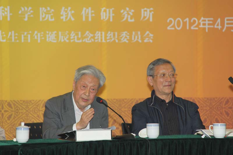 软件所首任所长许孔时(左)讲话 周巢尘院士(右)主持会议
