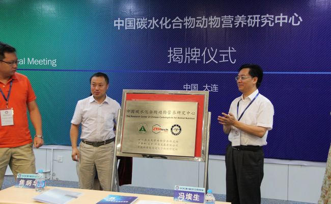 自2007年以来,本着交流最新研究成果,深化壳寡糖作用机制研究,开阔壳寡糖研发应用视野,拓展壳寡糖产业发展空间的宗旨,壳寡糖研究中心学术年会作为一个产学研相融合的交流沟通平台,已成功举办6届,已逐渐发展为我国糖生物学与糖工程领域较为重要的学术会议之一。年会期间,举行了“中国碳水化合物动物营养研究中心”揭牌仪式。此中心是在今年7月由大连化物所天然产物与糖工程课题组、四川农业大学动物营养研究所、中泰和(北京)科技发展有限公司三方共同筹建成立。四川农业大学陈代文副校长与吴德所长应邀回访并进行中心揭牌仪式,标志着“中国碳水化合物动物营养研究中心”进入正式工作阶段。