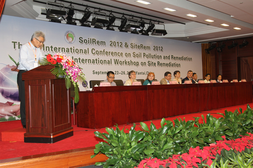 烟台海岸带研究所副所长(主持工作)骆永明研究员致开幕辞。CL:AIRE 成员、英国布莱顿大学Paul Bardos教授、美国纽约州立大学Lee A. Newman博士、上海市环境科学研究院副院长黄沈发教授、北京建工环境修复有限责任公司副总经理翟立前先生等国内外专家学者与企业界代表在开幕式上致辞。