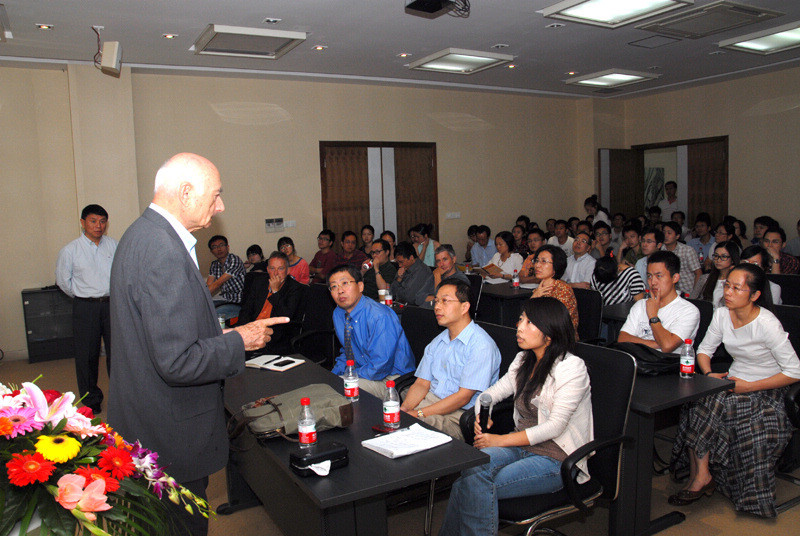 Peter K. Vogt教授围绕在肿瘤发生发展中具有重要功能的著名癌基因c-Myc,从其功能发挥机制和结构特点出发,提出了通过靶向c-Myc和其结合蛋白MAX相互作用而抑制其转录功能的抗肿瘤策略,并详细介绍了通过不同途径,包括荧光偏振、分子对接等筛选得到的具有良好抑制活性的三类c-myc抑制剂候选化合物,其中一个抑制剂显示出较好的体内外抗肿瘤活性。报告的提问环节,药物所的师生与报告人进行了探讨和沟通。