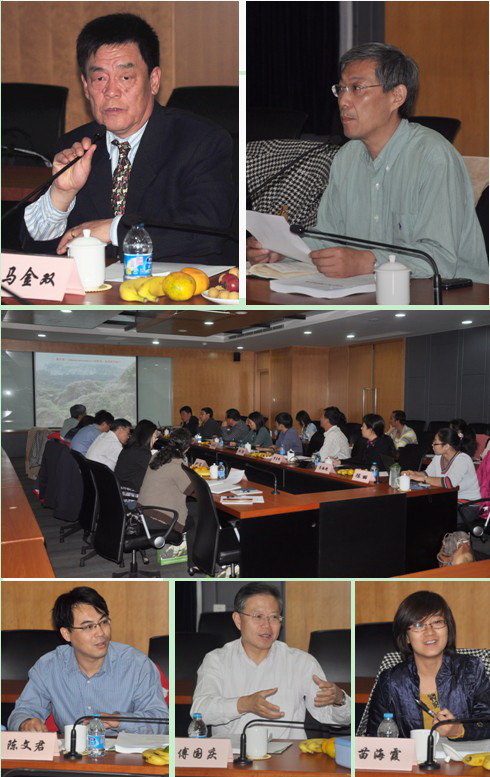 (右上,宋欣幸主持会议;左上,马金双汇报;中间,汇报会会场;下,从左至右:陈文君、傅国庆、苗海霞讲话)