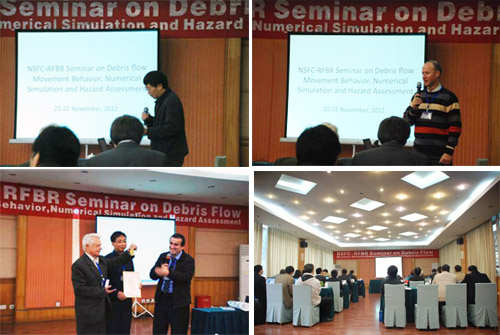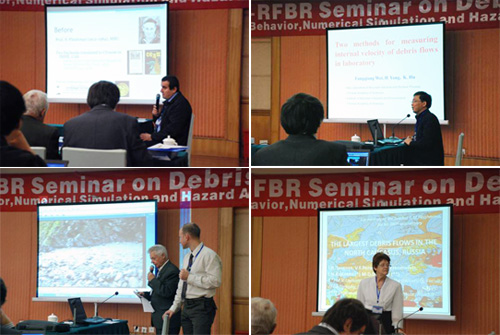 会上,俄方代表一行6人一一作了相关主题报告,报告内容涉及俄罗斯冰川泥石流和火山泥石流灾害及其评估、泥石流形成和运动模型、泥石流和溃决洪水过程模拟等方面的最新研究成果。中方代表作了泥石流流速及流变参数的测量、泥石流工程治理、泥石流预报数值模拟、泥石流流变特征、滑坡泥石流启动机理、泥石流灾害风险评估等方面的最新研究进展报告。双方还就泥石流启动机理、预报监测、数值模拟、参数测定以及灾害评估和防治等议题作了深入的探讨与交流,现场气氛活跃。