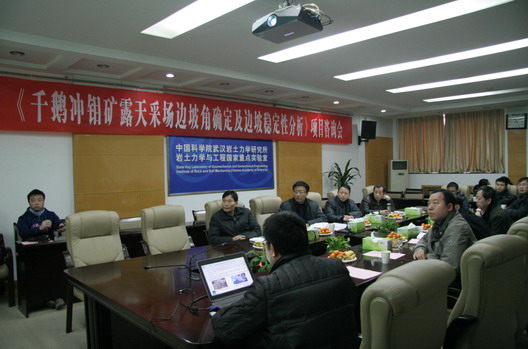 詹永祥博士代表项目组作“千鹅冲钼矿露天采场边坡角确定及边坡稳定性分析”研究报告。在认真听取项目组报告后,王克杰、苗明义等一致对项目组的研究工作给予了充分肯定,并针对相关问题进行了咨询并给出意见与建议。会上,双方进行了热烈交流,气氛活跃。