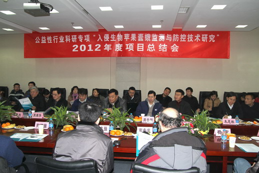 中科院动物所、全国农技中心、西北农林科技大学、中国农大、中国农科院植保所、中国农科院郑州果树所、河北农大、甘肃农科院植保所、新疆农科院植保所、北京中捷四方公司、新疆自治区植保站、甘肃省植保站、宁夏自治区农技中心、内蒙古自治区植保站、黑龙江省植保站等项目参加单位分别汇报了2012年取得的重要进展和技术示范情况。在项目组成员的共同努力下,2012年项目无论是在苹果蠹蛾监测的关键技术,还是在从卵-幼虫-蛹-成虫各个时期的生物防治技术、化学防治技术、人工防治技术以及在各个发生区的防控示范区建设方面,都取得了重要进展,尤其在长效监测诱芯、成虫迷向制剂、颗粒体病毒制剂、赤眼蜂释放技术、黑光灯防治技术、幼虫诱捕装置以及相关生物学特性、种群变异、遗传结构等基础研究方面取得了突破性进展,为今后的研究工作奠定了很好的基础。会议还对2013年的研究工作设想进行了部署安排。