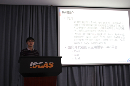 百度移动云事业部的汪恭正工程师作了“百度云应用引擎BAE”的报告,在报告中他对百度的BAE平台进行了详细介绍,并指出了百度相对于其它云服务更高的稳定性与安全性的优势,与用户之间形成双赢的局面。同时就BAE平台上的数据库导入、工程代码移植的成本、个人移动云的推送形式、BAE平台集成开发环境的展示等问题与青年职工们进行了探讨和交流。