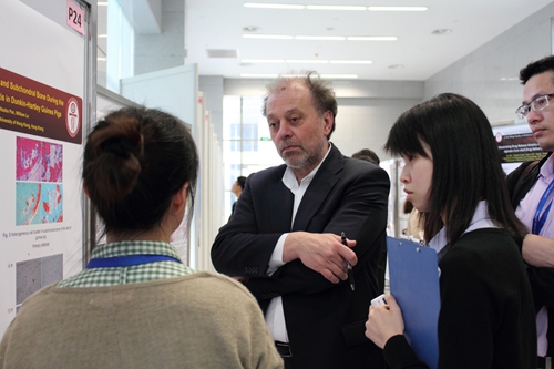 大会共设立专题讲座、大会报告、壁报展览、答辩及评奖、先进院参观访问等多项活动,其中大会报告分为骨与关节力学研究、生物材料与再生技术、生物治疗与关节疾病、转化医学与临床应用四个主题进行。来自瑞士达沃斯AO研究所Mauro Alini教授就“骨、软骨、椎间盘组织工程学”发表演讲;上海交通大学、上海市骨科内植物重点实验室主任汤亭亭教授与香港中文大学李刚教授等多位专家对间充质干细胞MSCs信号通路研究、分化潜能等进行了深入探讨;加拿大麦吉尔大学Fackon Mwale教授及加拿大多伦多大学Mark Erwin教授亦分别就“退变椎间盘再生潜能”的议题提出了自己独到的见解;荷兰乌得勒支大学Bjorn Meij 教授、香港中文大学秦岭教授、香港大学张文智教授等亦分别从椎间盘退变、骨坏死、脊柱侧弯等方面作了报告,从骨科基础研究到动物模型建立再到临床实践应用的过程、进展及发展趋势进行了全面的解析,引起会议现场共鸣,为参会者提供了一场再生医学、转化医学与临床应用的文化盛宴。