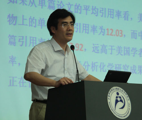 庄乾坤教授作了关于中国分析化学学科发展现状的报告。报告指出,自2007年以来我国在分析化学国际权威期刊Analytical Chemistry 上发表论文数迅速增长,且近年来篇均被引用次数已经超过美国,说明我国在分析化学领域的研究成果在数量上和质量上均有长足进步,但同时也存在着基金申请数目不足、研究方向趋同、创新性仍待提高等问题。庄教授强调,分析化学研究应以解决重大科学问题为目标,重视原始创新、重视人才培养、重视团队建设。新任Analytical Chemistry 杂志副主编,清华大学的张新荣教授就投稿应注意的事项与大家进行了交流。