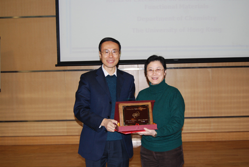 院士、香港大学任詠华教授(Prof. Vivian W.-W. Yam)应邀访问化学所,并作了题为Molecular Design and Assembly Strategies Towards Photofunctional Materials的分子科学论坛报告。杨振忠副所长主持了报告会,万立骏所长为任院士颁发了“分子科学论坛讲座教授”荣誉证书。
