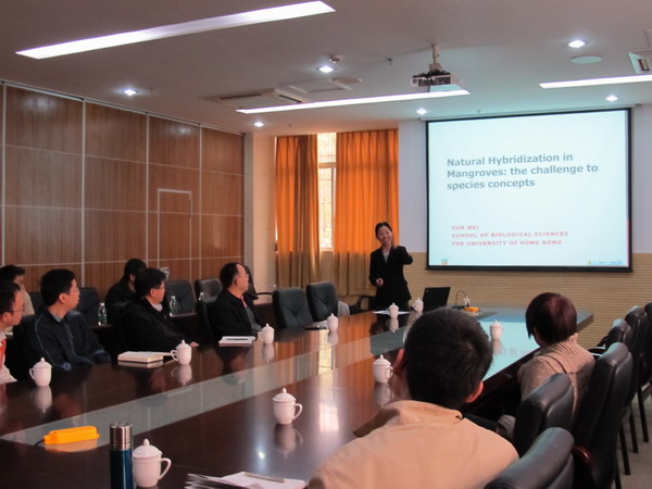 访问期间,孙梅作了题为Natural hybridization in Rhizophora and Bruguiera: three evolutionary scenarios的学术报告,详细介绍了她对世界范围内红树科两个重要类群红树属和木榄属物种自然杂交和遗传渐渗的研究结果,深入阐述了地理隔离在自然杂交和遗传渐渗格局形成中的进化意义及对物种概念的思考。报告内容丰富,现场气氛活跃,大家就物种形成研究的前沿及其发展趋势展开了深入讨论和交流。