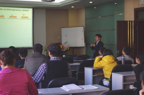 访问期间,邱恒山博士作了题为Probing Surface Reactions with High Resolution Electron Energy Loss Spectroscopy (HREELS)的学术报告。高分辨电子能量损失谱是研究材料表面反应的一个重要手段。报告中,邱博士详细介绍了高分辨电子能量损失谱在研究材料表面活性反应位点和反应中间态的基本原理、表征方法和分析手段,系统阐述了材料表面晶格振动、表面吸附振动、等离子体的激发和电子跃迁在光谱中的体现。随后,新疆理化所环境科学与技术研究室科研人员与邱恒山博士进行了讨论和交流。