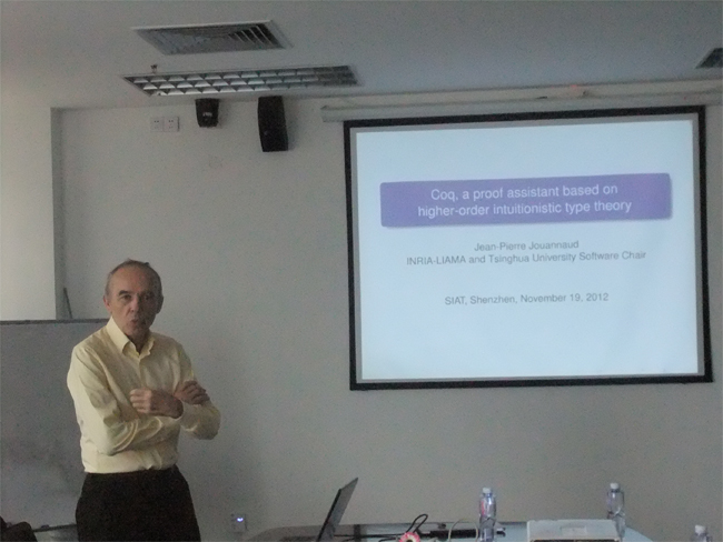 11月19日,法国国立信息与自动化研究院(INRIA)Jean-Pierre Jouannaud教授应中欧信息、自动化与应用数学联合实验室(LIAMA) 欧方主任、先进院特聘研究员Vania Joloboff教授的邀请在中科院深圳先进技术研究院进行学术交流,并作了题为Coq, a Language for Programming Correct Proofs的学术报告。