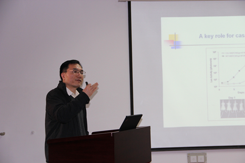 报告中,李川源教授描述了肿瘤细胞在放疗前后的反应和生长状态,提出肿瘤细胞周围的微环境会促进细胞生长的假设。经实验验证,发现受照死亡细胞CASPASE-3的激活对刺激存活细胞生长起重要作用。同时,通过对癌症病人的组织切片,证明了病人术后复发率与CASPASE-3阳性相关。此外,李川源教授还讲述了正常组织通过CASPASE-3 的释放进行愈合、再生及损伤修复的机理。最后,他结合日本科学家关于诱导型胚胎干细胞iPS的研究,分享了自己基于此研究得到的启示。