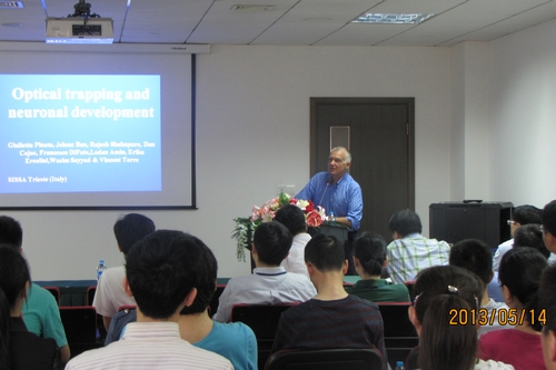 报告会上,Vincent Torre教授与陈勇教授分别就一种研究神经元功能的光镊技术和人造细胞微环境发展策略作了报告,并和与会人员进行了深入的交流。在中欧双边项目研讨会上,中方项目组成员详细介绍了与本项目相关的研究进展,并就项目开展过程中人员互访、分工合作等具体问题展开了卓有成效的讨论。报告会及研讨会由程国胜研究员主持。