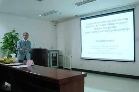 应工程塑料国家工程研究中心邀请,日本东北大学Yasuhide Shindo(进藤裕英)教授于6月20日上午来理化技术研究所交流访问,并作了题为Electrical Resistance and Deformation Behaviors of Carbon Nanotube-based Polymer Composites under Tensile Static and Cyclic Loadings的学术报告。