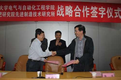 4月25日,中科院合肥物质科学研究院先进制造技术研究所与合肥工业大学电气与自动化工程学院全面战略合作协议签字仪式在合肥工业大学举行。合肥研究院副院长、先进制造所所长梅涛和合工大电气学院院长何怡刚分别代表双方在战略合作协议书上签字。