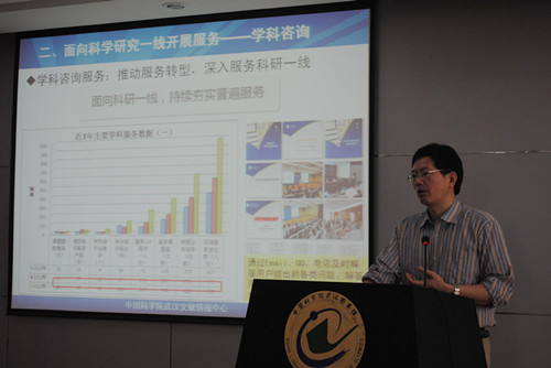 随后,各成员单位代表针对本次会议的主题——“开放创新环境下科研图书馆的知识服务”进行了研讨。来自湖北省科技信息研究院、湖北省社科院图书情报中心、东风汽车图书馆、同济医院图书馆和武汉分馆的五位代表分别结合本单位开展文献信息服务的实例和经验进行详细介绍。期间,各成员代表还针对目前文献信息服务的需求和发展,以及如何加强科研图书馆之间的资源和优势合作阐述了自己的意见。
