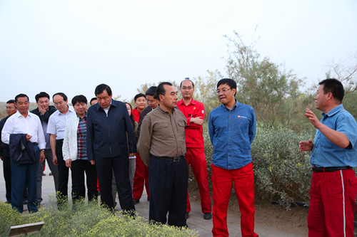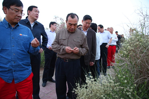 5月23日,新疆维吾尔自治区党委常委、自治区副主席库热西·买合苏提一行访问中科院塔克拉玛干沙漠研究站,并参观了塔中植物园。
