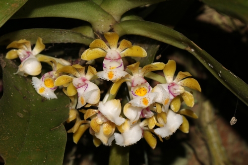 无茎盆距兰深秋的西双版纳热带植物园,在沟谷雨林兰园中树上的一种附生兰花——无茎盆距兰Gastrochilus obliquus (Lindl.) Kuntze,正盛开着一团团...