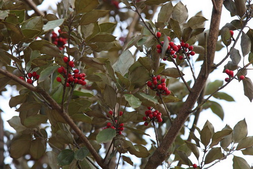 天气转寒,上海辰山植物园(中科院上海辰山植物科学研究中心)珍稀植物园内几株高大的舟山新木姜子依然生机盎然,鲜红圆润的果实簇生在枝条上,在绿叶丛中分外耀眼。