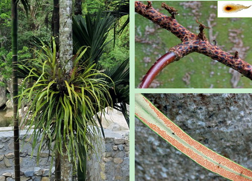 在野外考察过程中,采集到珍稀濒危植物南洋石韦Pyrrosia longifolia。该种在国内仅海南岛有标本记录,且只有10份,距离最新采集的标本已过去整整50年(曾沛12899,采集日期:19621210;采集地:海南省,万宁市乌石港)。张宪春(2012)在最新出版的《中国石松类和蕨类植物》中推测该种在中国野外已经灭绝。此次野外成功采集,对研究南洋石韦的物种分布及生存状况具有重要意义。