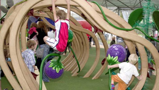 比如园内有一处室内儿童游戏区名为攀爬架(Climbers and Creepers),里面有食虫植物的大模型——有猪笼草形状的滑梯,有模仿匍匐植物的设施,有食草动物区。该项目的主题有两个:一是植物和动物是相互依赖的;二是植物、动物和人类的相互作用对三者的生存都是至关重要的。在这里,所有的植物都被放大了数倍,孩子们可以把自己想象为“昆虫”,在其中穿梭,了解花朵的结构,攀爬到植物模型上了解传播授粉的过程等。