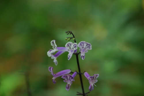 唇形科植物,多年生草本。高60-90厘米,四棱形,紫黑色。叶纸质,对生,叶片上表面密被点状腺毛,紫绿色,下表面被长柔毛,紫色。轮伞花序具2-3花,组成顶生和腋生的总状花序,花序长约3-10厘米,常呈圆锥状,密被柔毛,苞片线形,长2毫米;花萼钟形,长约4毫米,萼齿5,上唇3齿,中齿宽大,侧齿小,下唇2齿较小;花冠紫色,长约1.5厘米,上唇宽大,2裂,下唇全缘,雄蕊4,内藏,雌蕊外露,突出花冠外。