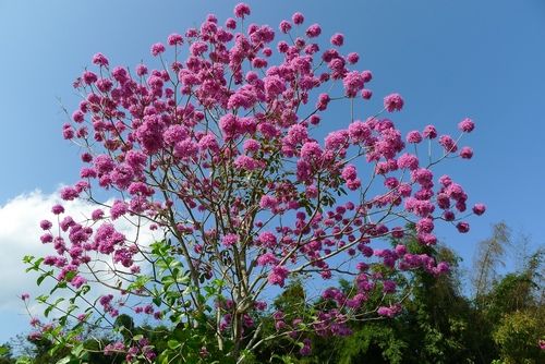西双版纳热带植物园栽培的洋红风铃木于1978年从墨西哥以种子的形式引进,2006年以孤植树形式移栽在百花园,现满树挂满粉紫色的花朵,数朵小花聚生成团,花团锦簇,极为壮观,具极高的观赏价值。让游客和路人都发出好花美丽不常开的叹息,为版纳植物园又增添了一道亮丽的风景。
