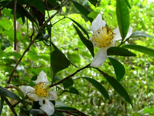 云南山枇花属于山茶科,分布在云南腾冲、景东、昆明、文山等及缅甸北部海拔1100-2400米的阔叶林下或常绿灌丛中。树高3-8米,常绿。叶薄革质,顶端微凹,边缘具锯齿。花白色,单生或有时3-5朵的短总状花序,小苞片多,花瓣5,近圆形;雄蕊多数,长1-5厘米。蒴果圆柱形,木质。因其花药呈黄色,又称为黄药大头茶。其花期11-12月,果期次年8-9月(云南植物志)。