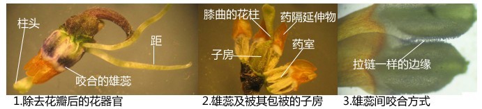 当“肥蜂一号”携带满口花粉,降落到下花瓣时,短喙与槽分离,肥蜂一号将口器从此插入以获取传粉犒赏。当其努力往距内伸入口器时,头部触及柱头面,此时,柱头短喙上的柱头孔溢出无色透明的粘液,肥蜂一号口器上携带的花粉被这些粘液吸附,而花药附属物此时已被柱头背面顶开,自身花粉又可以落入沾满粘液伸入距内觅食的口器上,当“肥蜂一号”离去,授粉与传粉就在一进一出间完成,自花花粉和他花花粉也被巧妙地“置换”。