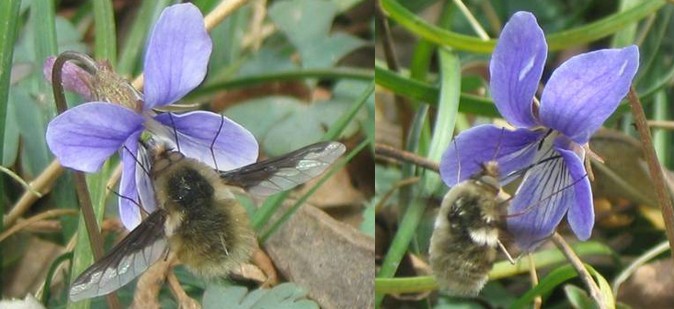 就是这家伙触动了开关!当“肥蜂一号”将长长的口器伸入距中,其头部挤到早开堇菜宽大的三角形柱头面,柱头受到力的作用,撑开药隔附属物,此时花粉乘机漏出药室,准确地落到“肥蜂一号”的头部与口器上。