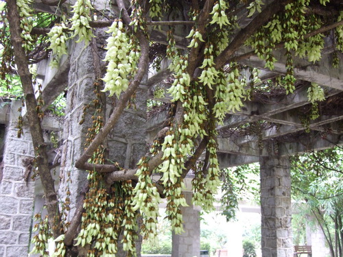 禾雀花(Mucuna birdwoodiana Tutcher),蝶形花科黎豆属,又名白花油麻藤、雀儿花,常绿木质大型藤本。分布于广东广西,喜温暖湿润气候,耐荫耐旱,畏严寒。该种生长迅速,蔓茎粗壮,叶繁荫浓,茎长可达30米以上,其生命力顽强,能盘树缠绕,越冠飞枝,攀石穿缝。其花序悬挂于悠长盘曲的老茎上,吊挂成串,每串二、三十朵,串串下垂。酷似无数白中带翠,如玉温润的小鸟栖息在枝头。
