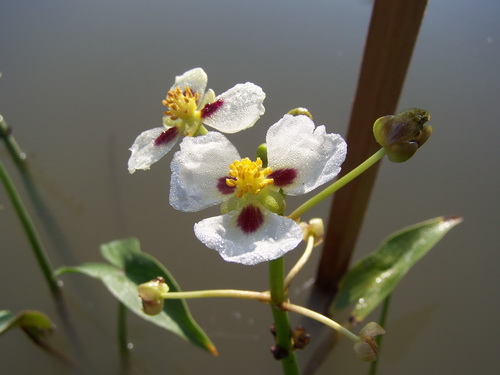 大慈姑是华南地区近几年新引种的水生花卉,它株形美观,叶子宽箭头形,厚实,叶表面光亮翠绿,叶脉清晰;花葶粗壮,直立、挺出水面,花朵大,白色,花瓣基部有紫色斑块;花色鲜艳,耐看,且花多,花期长,广州地区种植全年都可开花。