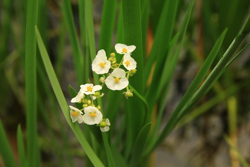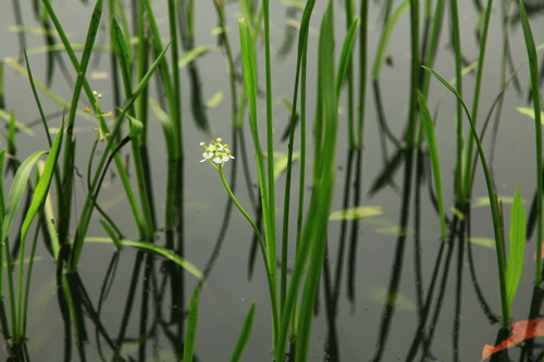 一池清水,一枝枝长条形的叶子亭亭玉立地挺出水面,洁白的小花点缀在嫩绿青翠的叶丛中,欢快的鱼儿在叶底来来往往的戏水,芳姿倒影,闲情惬意,这就是泽泻慈姑展现出的一幅朴素静谧的水墨画景象。