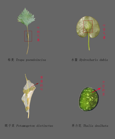 而对于水生植物,为了适应水生环境也演化出一些有趣的形态结构。首先为了漂浮在水面,水生植物的器官产生了一些特异的变化。这种变化有的表现在叶片上,有的表现在茎上或者其他部位。例如菱角,它的叶柄中间有一个气囊,例如水鳖,它的叶片背面有隆起的气囊。这些气囊就像泡沫一样,可以产生浮力,让植物体漂浮在水面上。另外我们知道植物生长需要水、空气、营养和阳光。水生环境中有充足的水分,营养和阳光视环境而定,一般并不缺乏,但水里缺少空气,只有少量的空气溶入其中。水生植物要获得空气就不能像陆生植物那样便利。这些气囊同时也可以吸收储存空气,通过中空的茎传给植株水下的部分。例如,再力花的茎就有很多中空的孔道,将茎截取一部分,对着一头吹气,气体就会从另外一头出来。