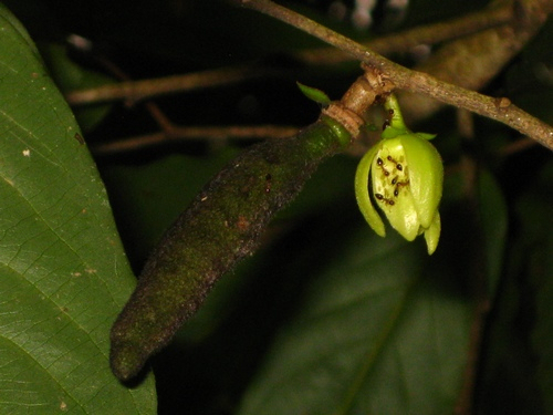 云南哥纳香仅产于云南河口、金平、屏边等海拔150-470米密林中。引种栽培地物候观察显示:1、其盛花期在2-5月,常看到花果一起出现。这种现象与植物花果期长短、间花现象、当年开花果实次年发育等繁殖生物学特性有关。2、花朵有腋外生(茎生)现象。看到花果和成熟的心皮双双悬挂于树干,令人有种“家庭团聚,和睦相处,相伴一生”的欣慰感觉。