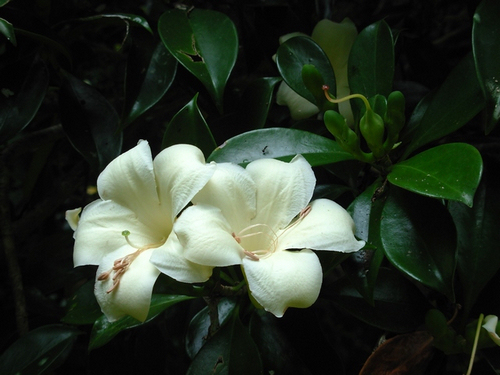 灰莉木(Fagraea ceilanica Thunb.)马钱科,乔木,高可达15米,树皮灰色,叶片稍肉质,椭圆形、卵形或倒卵形,有时长圆状披针形,顶端渐尖,叶面深绿色;花单生或组成顶生二歧聚伞花序,花序梗短而粗,花萼绿色,肉质;花冠漏斗状,质薄,稍带肉质,白色,芳香;种子椭圆状肾形,藏于果肉中;花期4-8月,果期7月至翌年3月。