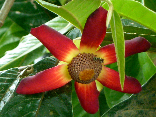 大花紫玉盘,又名山椒子、川血乌、红肉梨。叶互生,长倒卵形;全年生长。花较大9cm左右。萼片3,其中2萼大1萼小。花瓣2轮。覆瓦状排列花瓣5-7枚,6枚的较多,花瓣排列成2轮,紫红色或深红色,数量众多的雄蕊、雌蕊聚生于花瓣中间,宛若紫色玉盘上盛放着的黄色水晶;大花紫玉盘花数量虽少并且藏于叶背开放,花色却异常艳丽,常于万绿丛中透出点点惹眼的红色,若是凑近细闻,更有淡淡的芳香。花后结果,花的座果数不等1-53个之间。果聚生于“果盘”上,果实向四面八方伸展。果实自幼果到成熟要自然脱落40多个幼果。