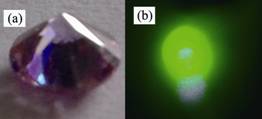 图4 (a)打磨抛光后的氧化钛基玻璃,(b)玻璃的上转换发光示意图