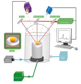图2是以上四种悬浮无容器技术工作时的示意图。气悬浮技术操作简单、成本低廉、无需反馈系统、对材料电性能无要求,因此广泛用于材料的无容器处理与研究。图3是气悬浮无容器技术的工作原理示意图。从图中可以看到,高速可控气流自下而上对样品进行作用,使样品稳定悬浮在喷嘴中,激光自上而下对样品进行加热熔化。熔体通过自身的表面张力而被约束为球形,待到熔体均一稳定后,关闭激光,深过冷的熔体快速冷却,凝固成常规条件下难以制备的玻璃体。