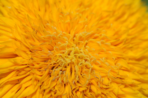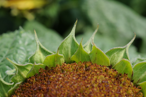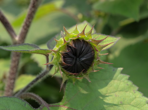 菊科出身的向日葵总是以一副大大咧咧的形象出现,这与其同门姐妹菊花高雅傲霜的品性相差甚远。其植株强壮,具粗硬的刚毛;其叶通常互生,心状卵形或卵圆形,边缘具粗锯齿,两面有糙毛,有长柄。巨大的花盘生于植株上端,花的结构十分别致,花盘上有两种花,即舌状花和管状花。舌状花1~3层,整齐地排列在花盘的周围,如轮似盖,为无性花。它的颜色和大小因品种而异,有橙黄、淡黄和紫红色,具有引诱昆虫前来采蜜授粉的作用。管状花,位于舌状花内侧,小而色暗,为两性花。花冠的颜色有黄、褐、暗紫色等,可结实,俗称葵花籽,可食用。