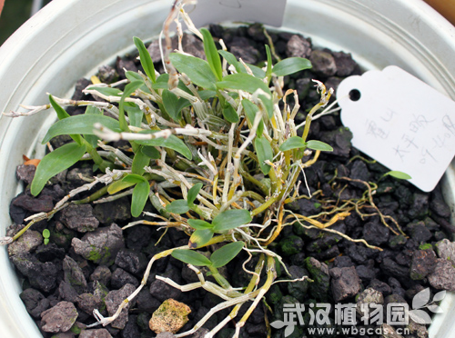 武汉植物园保育有一丛石斛。它的茎秆肉质,青黄色,茎秆的基部较粗,向上逐渐变细。茎秆的上部长出绿叶,叶子长圆形,一片片地从茎秆上斜向上生长,像探出的舌头,可爱玲珑。不过,整体看来,盆中的这丛石斛细细的、小小的,并不起眼,然而草也不可貌相,它不是一般的石斛,而是有着“仙草”之称的霍山石斛(Dendrobium huoshanense)。