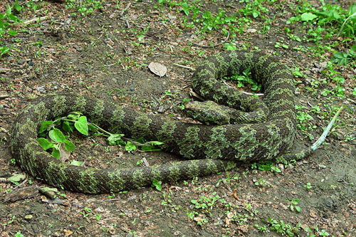 在湖南的莽山上生活着一种奇特的蛇类——莽山烙铁头蛇Zhaoermia mangshanensis, 当地居民称“小青龙”,它是一种大型的管牙类毒蛇,全身长可达2m左右,通体黑褐色,其间杂以极小黄绿色或铁锈色点,构成极细网纹印象,背鳞的一部分为黄绿色,成团聚集,形成地衣状斑,能够很好的隐藏在周围环境下,尾后半部为白色。