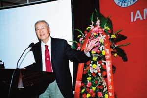 叶笃正在国际气象学与大气科学协会(IAMAS)及IAMAS中国组委会为他举办的九十华诞纪念大会上发表热情洋溢的即兴演讲