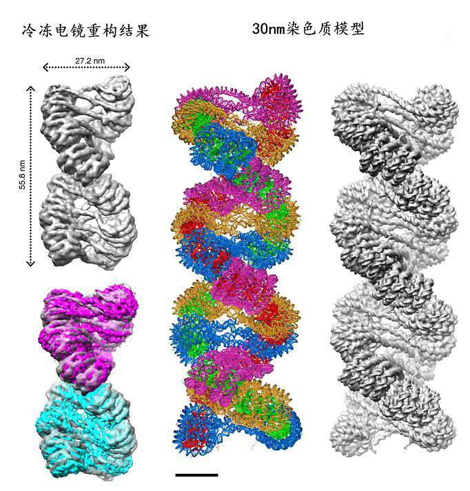 生物物理研究所一项关于30nm染色质高级结构解析的重大成果。生物物理所长期从事冷冻电镜三维结构研究的朱平研究员和长期从事30nm染色质及表观遗传调控研究的李国红研究员通过多年的紧密合作和不懈努力,发挥各自专长和优势,成功建立了一套染色质体外重建和结构分析平台,利用一种冷冻电镜单颗粒三维重构技术在国际上率先解析了30nm染色质的高清晰三维结构,在破解“生命信息”的载体——30nm染色质的高级结构研究中取得了重要突破。该结构揭示了30nm染色质纤维以4个核小体为结构单元;各单元之间通过相互扭曲折叠形成一个左手双螺旋高级结构(图1)。同时,该研究也首次明确了连接组蛋白H1在30nm染色质纤维形成过程中的重要作用。本研究论文的评审人评论说,“30nm染色质结构是最基本的分子生物学问题之一,困扰了研究人员30余年”,该结果是“目前为止解析的最有挑战性的结构之一”,“在理解染色质如何装配这个问题上迈出了重要的一步”。