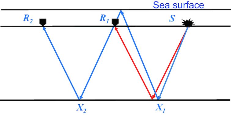 图1 波场传播路径。震源S激发的地震波在R1处记录为上行反射波和下行鬼波,在R2处记录为上行的地下多次反射波。R1鬼波为R2多次波的二次震源,S处鬼波为干涉效应(未标出)